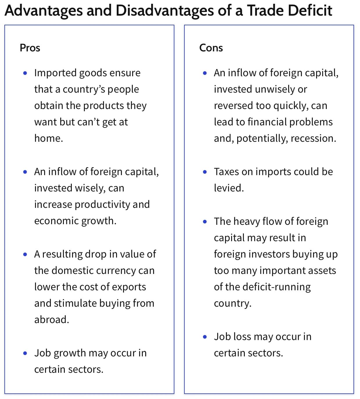 Another economic term that has been discussed ad nauseam by President Trump, which goes hand-in-hand with his administration’s perception of tariffs, are trade deficits. In short, a trade deficit means that one country is importing goods at a higher value from another country than it is exporting back to that particular state. Unfortunately, misinformation surrounding the concept, along with the word “deficit” having a negative connotation, means that many Americans perceive trade deficits the United States has with countries like China as inherently bad for economic prosperity, which is simply not the case. With that said, there are explicit disadvantages to having trade deficits with economic partners. The figure below helps to highlight the positives and negatives of the concept: