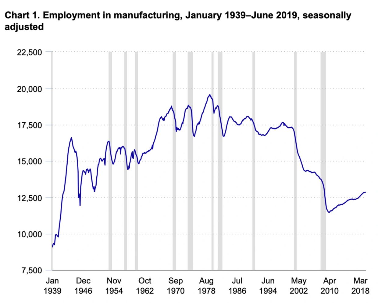 The main disadvantage of trade deficits, and a point of contention that President Trump has with them that I entirely agree with, is the fact that these deficits lead to decreased domestic jobs in the manufacturing sector. According to the U.S. Department of Commerce, in 2024, only about 13 million Americans worked in the manufacturing sector, making up 10.3% of the country’s GDP, but only 8% of the eligible population working in that field. The chart below highlights the decades-long decline in American manufacturing, which has been a growing issue throughout the years:
